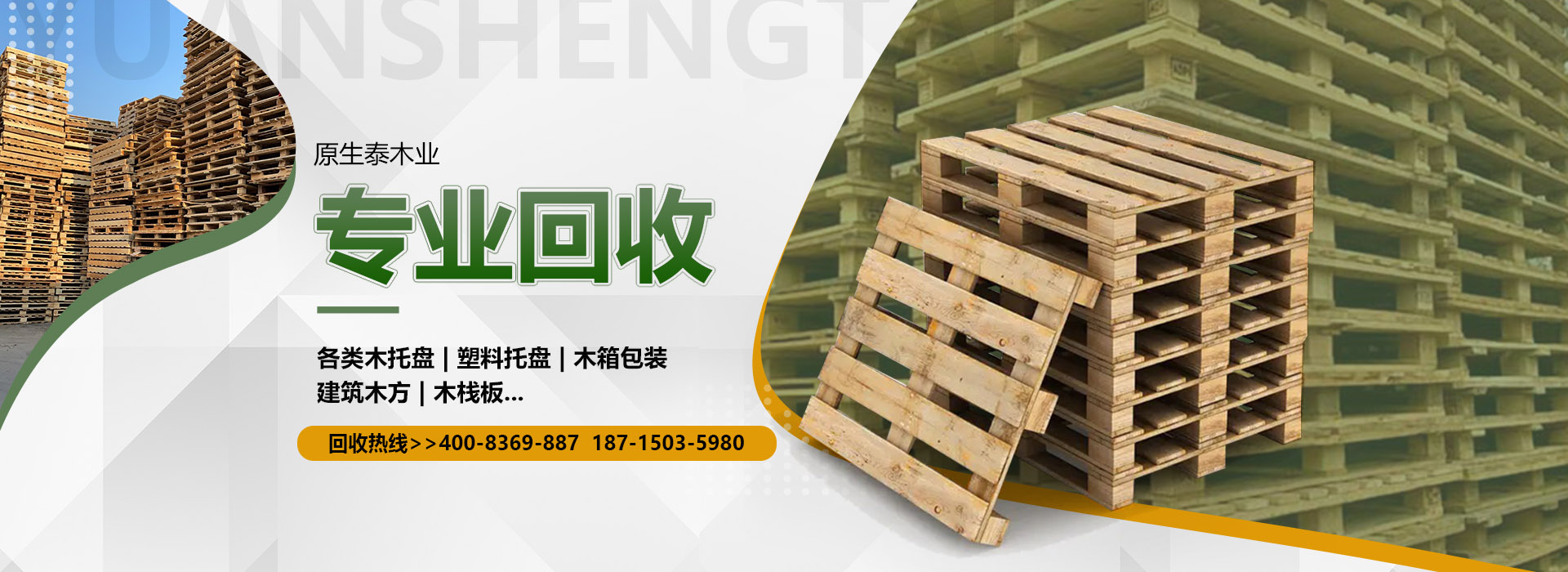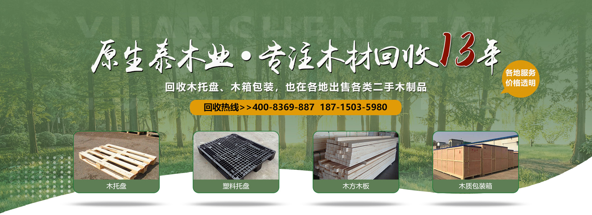 關于我們原生泰木業有限公司是一家服務各市的企業,本公司是以回收各類二手廢舊木材為主,主要回收各類木托盤、塑料托盤、木箱包裝、建筑木方木板、木棧板等等。本公司收購價格以托盤、木箱木材的規格、使用情形、新舊程度、材質為估價標準,如果您有意向出售您的閑置木制品以及塑料制品,請您聯系我們時告知其數量、尺寸、型式、使用情形,我們免費為您提供電話估價或到現場報價。本公司是一家經工商局嚴格注冊的正規木制品回收公司,回收木托盤、木箱包裝致力于環保建設、綠色合作以求雙贏。同時原生泰木業公司也對各地范圍出售二手木托盤、二手塑料托盤、各種二手木制品。及時送貨上門,價格公道。公司下轄木材加工廠,組裝廠,并備有大型標準烘房,多功能平板刨,壓刨,挖槽,機械設備等。產品主要生產各類木托盤、木包裝箱銷往國內大中型城市并隨貨通行出口國外。本公司將以豐富的知識,提供合適的方案來服務和滿足每一用戶不同的需求,品質至上,誠實守信。